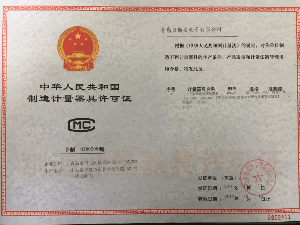 我公司是青島市具有國(guó)家質(zhì)量技術(shù)監(jiān)督部門頒發(fā)的計(jì)量器具生產(chǎn)許可證的生產(chǎn)企業(yè);獲得國(guó)家防爆電氣產(chǎn)品質(zhì)量監(jiān)督檢驗(yàn)中心頒發(fā)的防爆合格證;獲得國(guó)家公安部消防產(chǎn)品合格評(píng)定中心頒發(fā)的消防產(chǎn)品形式認(rèn)可證書。